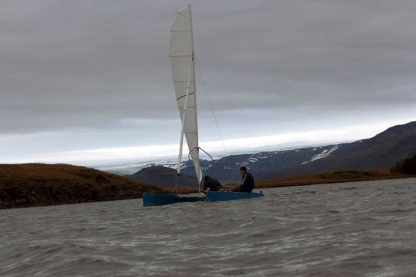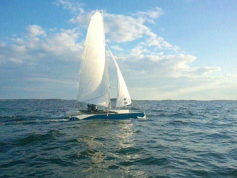SC 435 has asymmetrical hulls and is build in a form of matched hole technique used in the aircraft industry. In this way the hulls are self aligning. There is no need for jigs etc. The hulls are plywood/glass/epoxy constructions. One hull consists of only 10 parts! Beams and mast are made from standard aluminum tubes to speed up construction and safe money.The boat is a perfect beach cat, very good to handle even in a lot of wind. No tools are necessary to set the boat up, or break down after a days sail. The boat is light enough for roof rack transport.