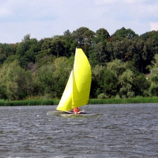 Note: This plan has been updated and amended. It can now be built with a unique rig. It is a rig with a vertical mainsail shortening system, normal stays, and a jib. It is a further development of my mast top rotor, which I developed for the Tiny Tri some years ago. The system is working perfectly. - Bernd