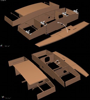 The plans detail all the dimensions, the parts nesting on plywood sheets, and the complete building sequence in 3D.