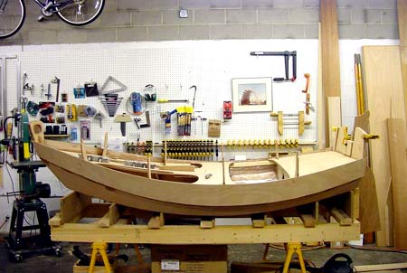 Construction is as simple as I could devise, she has a flat panel bottom for stability, the frames are cut from plywood and are set up over a central spine which aligns them and also forms one side of the centrecase. Stringers wrap around the frames from bow to stern and ply planking is fitted over those. The seat tops form buoyancy tanks at each end, tanks that contribute to the stiffness as well as providing good seating.