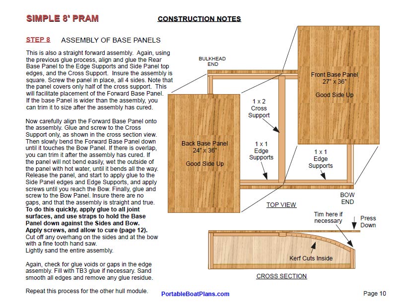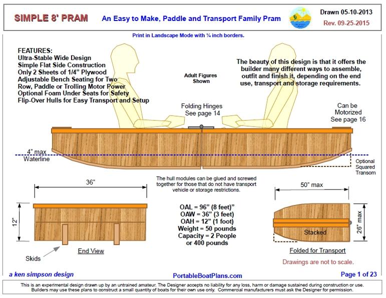 The design of the SIMPLE 8' PRAM is in response to a request for a low cost, stable, portable boat. It includes a wide beam, good freeboard, generous volume, seating for two, and safety buoyancy. It is sturdy, easy to build, quite portable, easy to paddle and can utilizes a trolling motor.