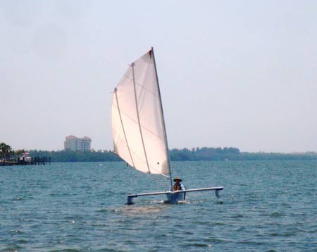 So if you're looking for a quick little 2-seater boat that's comfortable, nimble, ultra-stable, super-fast to rig, gets you sailing in just 10 minutes, and will run circles around most other sailboats - you have just found it! The "Slingshot 16" trimaran will hit 14 mph, points higher than 45 degrees, and turns on a dime - all while you (and one companion, if you wish) sit comfortably in your seat, facing forward, with both hands free thanks to foot-pedal steering. She can be launched in 5" of water and sailed away - upwind - in just 7".