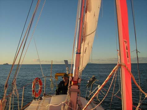 Our little cutter proved to be a very capable sea boat, easy to handle, not at all sensitive to trim or conditions, easy to work, faster than most would expect and very capable of making long voyages in reasonable comfort. We took turns on watch in the deep and comfortable cockpit, did a couple of changes of sail finding that the combination of wide side decks and cutter rig made for an easily worked rig, off watch we slept surprisingly comfortably in the big bunks down below considering the horrific conditions, and although it was not the sort of weather I'd choose to go out in, it was a very good experience to look back on. We had a good time and the while the little boats first sunset was a very black and threatening one her first dawn at sea was just beautiful.