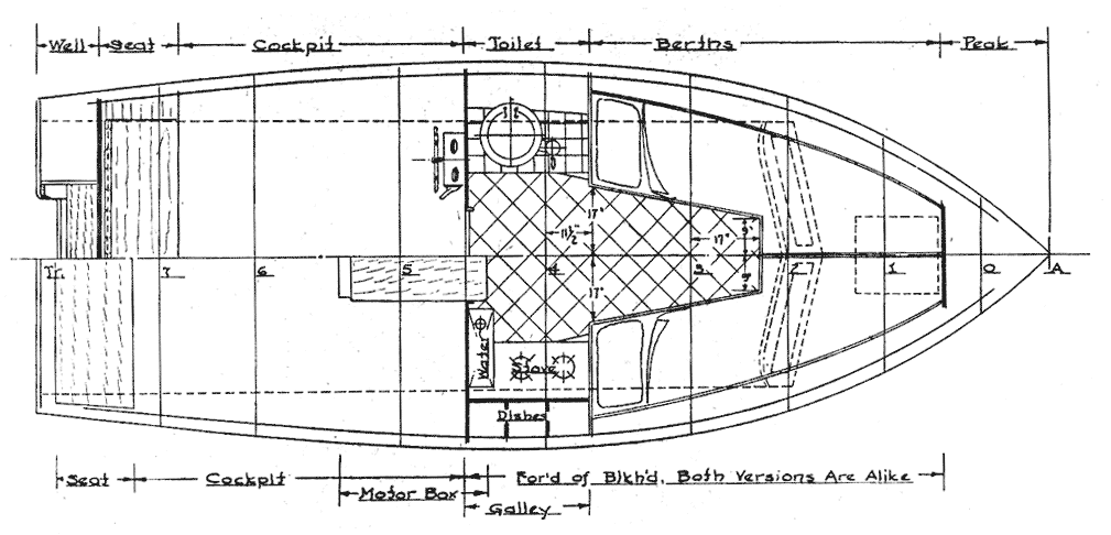 Individual desires always creep into one's execution of the interior of any cruising boat. The sky is the limit as far as trickiness is concerned, but don't forget that this boat, like all other careful designs, is designed to a weight. Performance is a matter of horsepower per pound, and behavior is a matter of loading the shape to the correct angle of attack. If you change weights, try to put in a cast iron stove, install the old family refrigerator and build a dog house for Rover, she then becomes your design and headache—not mine.