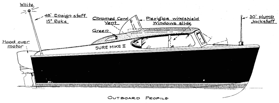 HERE WE HAVE Sure Mike II, ideally calculated to take the largest stock outboard motor, the Mercury Mark 55. This boat is 21 feet long with an 8-foot beam. She probably comes closer to the size of small cruiser desired by most men than any other boat of this type we have run in the Boatbuilding Annuals.