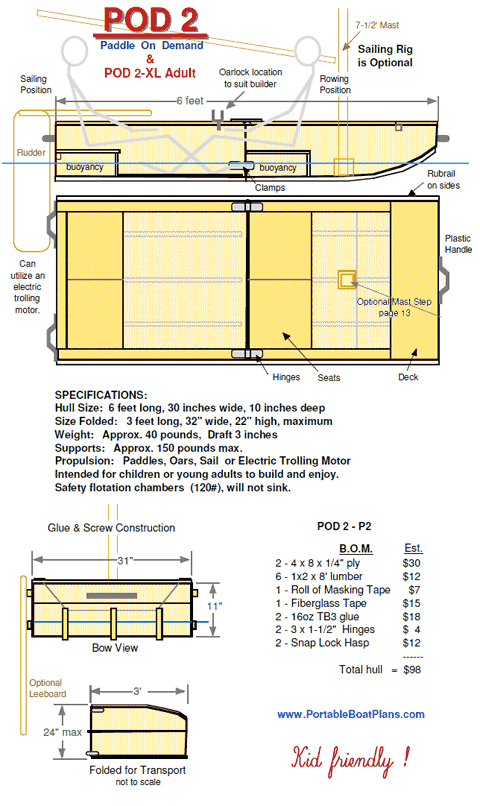In the design phase, certain elements had to be adhered to: it had to be lightweight, portable, safe, easy to build, and low in cost. POD is all these things, and is fun to build and fun on the water. It transports nicely IN any vehicle while on the way to the water. It is lightweight, so even the youngest can carry it, or pull it. And it stores in a closet or corner of the garage in only 3 square feet of space, when not in use.