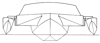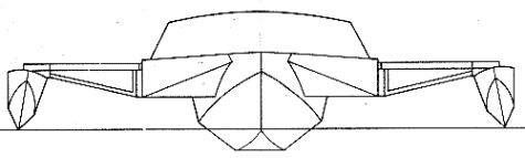 So as not to affect the accommodation, two leeboards are used in lieu of a centreboard. They are of fairly small proportions to fit alongside the wing structure, with an effective depth of 500mm from static waterline which will increase with heel [the leeward board]. Both boards would be down for short tacking.