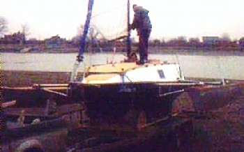The folding system uses circular aluminium main beams mounted in bearings to give the choice of horizontal, vertical or inverted horizontal hinge axis orientation. This allows the amas to be swung up on top of the cabintop for trailing, in against the main hull for docking or down below the main hull to assist in righting in the event of a capsize. To date the principles of it have not been tested.