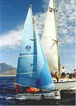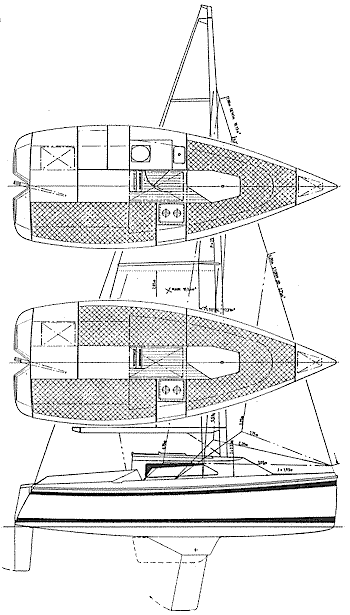 The hull form is very much like a mini BOC racer with shallow underbody, almost plumb bow and broad, flat stern sections. It is very efficient both upwind and down. There are planing boards to extend the sailing waterline aft, with the transom hung rudder mounted in a V-shape cut-out. The moulded-in boarding platforms do away with the need for a swim ladder and are a magic place to sit when sailing in protected waters.