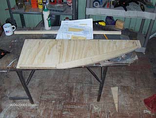 Construction began in the begining of June in the front of my house (it is an old store front and I am single so dust and noise where not a concern). It was a slow process due to work hours and life in general. I stayed in touch with Ken thruout the construction, sending photos and asking questions whenever I needed some direction. As this was my first attempt at boat building I took my time and made sure before anything was cut or installed that it was correct. This entailed holding pieces togther with clamps or by hand and visually confirming all measurements and angles. I decided to make the center and front sections first, as they were covered in detail, and by the begining of July the first two sections where complete and work began on the uncharted rear section.