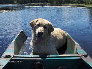 We rowed along for a long time enjoying the day, and while relaxing I noticed how high we still rode in the water. I'm 170 lbs and Jake is 80 lbs, and I am confident the boat can handle all my hunting gear with ease. It will take some time to train Jake to retrieve from the boat, and I am also going to add a flip down ramp in the rear to assist him in getting back aboard from the water, but this may have to wait until winter, as hunting season is upon me.