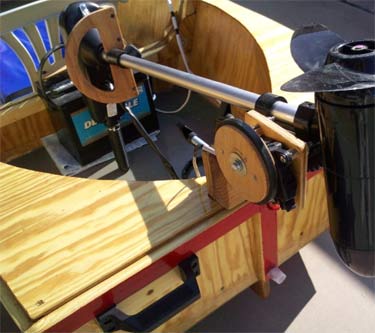 Steering the rudder has been perplexing to me. On the one hand I want something solid in my hand, a tiller, that translates directly to rudder movement. However, having to shift position as the boat tacks from one side to the other, requires the tiller to be either short or capable of being flipped to either side. This is a small boat, and maneuvering room is at a premium. I first built a flip-over tiller, and it worked OK, allowing proper control of the rudder. But, it is bulky and sometimes got in the way. If you remember, I had the same complaint on the Pollywog. Eventually I decided to take another approach. Rather than solid, I chose flexible. With the addition of 4 pulleys strategically positioned, I was able to attach a 3/8" nylon rope from the rudder, along the port side, over to the starboard side, and back to the rudder (pictures below). This provides push-pull control of the rudder from anyplace in the cockpit, at any time. It works so well that I have added it as an option for the trolling motor version as well, without retrofit.