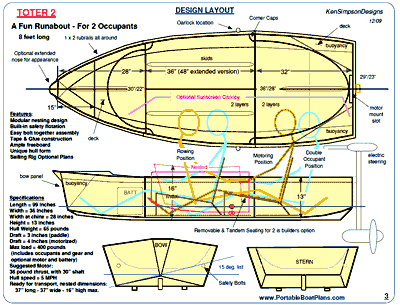Back to the plans, which consist of 25 pages of drawings, photos and text, and describe to the best of my ability, how to mate the sail plans with the hull plans. If somebody builds the boat, and decides at a later date to add the sail rig, it is entirely possible. My only suggestion is they build the 4-foot extended center version, as it provides a better sailing hull. As you may have noticed on my website, I am offering 2 plans for the price of 1 during these difficult economic times. What this means for TOTER 2 builders is that they can get the Sail Plans for free. I contact them after they purchase a plan set, and ask what other of my plans they wish to receive, for free. It is my way of saying thanks.