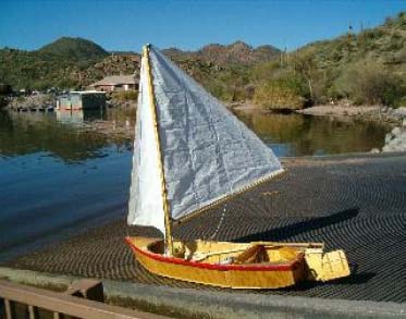 Well, as promised, the TOTER2 SAIL Plans are now available. It has been a fun, yet demanding, project. Some of the rigging details were lifted from the Pollywog, but because this is a smaller boat, new and simpler methods of assembly and attachment were devised. First, let me say the TOTER2 hull has proven to be up to the task of being driven by the wind. The optional 4-foot length of the center module works especially well with the sail version and is strongly suggested for those that intend to use the boat for both motor and sail functions. Because the 10-foot mast design is of the take-apart type, it was necessary to provide support stays for rigidity. The 7-foot boom folds in half, and both can store in the bottom of the center module for transport. The sails, main and jib, are of white polytarp, and the plans provide instructions on how to fabricate them from the larger tarp material. Halyards conveniently run through the center of the mast. Attachment points for all sail-related gear are by large screweyes and snap hooks. This deviates from sound marine practice, but the boat and sails are small, and so are the forces acting upon them. I am sure some builders may opt to upgrade the hardware, but as specified, the total cost of sail-related materials is under $125.