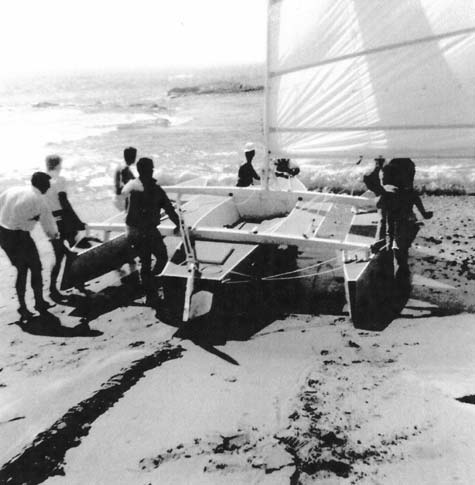 Some people will say, "I am not greatly interested in speed, l just want to cruise. Give me safety, with speed a secondary consideration." No argument there, we all want safety, first and the time. There are various kinds of safety. Appendicitis or an infection from a trivial appearing wound may occur on any boat. Speed in reaching treatment is important here. Safety from capsizing is the area which is principally dependent on the design of the boat. A boat will capsize only when the wind forces can push it over easier than they can push it ahead. The multi-hull boat cannot heel to spill the wind, its ultimate safety will depend on its ability to spill the wind by spurting ahead when the knockdown gust strikes unexpectedly. l would not be so rash as to say any boat is non-capsizable, but certainly, the one with the least resistance to forward movement when the lee float is heavily loaded will be most non-capsizable. So, the planing float trimaran gives safety as the result of speed and not at the expense of it. I am sure that anyone who understands the situation will want the fastest boat under these conditions.