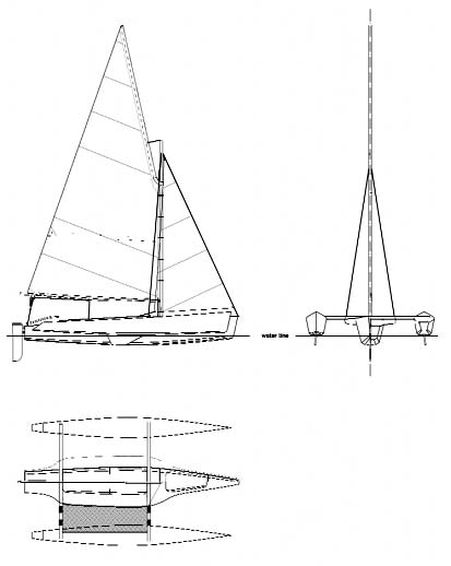 It is not the ideal solution for sailing upwind and obviously, we cannot expect this boat to beat against the wind as an American Cup boat would do, but this limit is compensated by absolute speed. While sailing, the boat reaches its best and it is extremely fast and enjoyable. The construction of the TRICKY FIVE is stitch and glue and is very simple. The finishing of internal edges, the most tiresome and lengthy task of this construction technique, is reduced to the minimum, as the internal edges are hidden in the hulls or under the double bottom of the central hull. Outside, all the edges are covered with a single layer of fibreglass - which makes the hull rigid, solid and resistant to abrasion.