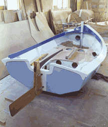 Built from Plywood and Marine Supplies sheet plywood and fastened with Sikaflex flexible adhesive/sealant (Thanks Gordon) the prototype is going together well, we've cut the transom down to take a small outboard so her owner can take her fishing, have today poured the lead into the centreboard and will be painting her outside tomorrow. Lake Rotomahana has really neat little coves, so tiny that a launch would not squeeze in, and Jan already has tried fitting our pile of camping gear in the big space under the foredeck so I'd better quit the computer and get on with the job!