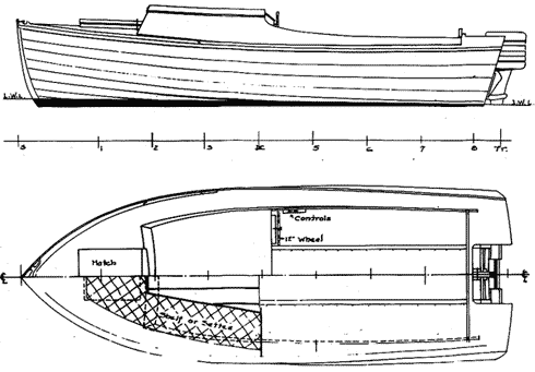 "TRUMPET" - 18' Rough water clinker-built runabout, wood. This is a modified v-bottom outboard powered "pocket cruiser", with cuddy cabin and bunks forward. 6' 6" beam. Includes 1958 original article run in Sports Afield's Boatbuilding Annual, lines, table of offsets, construction plans, inboard and outboard profiles, and other details.