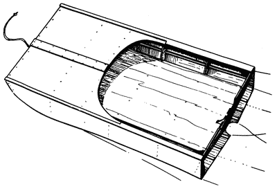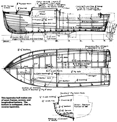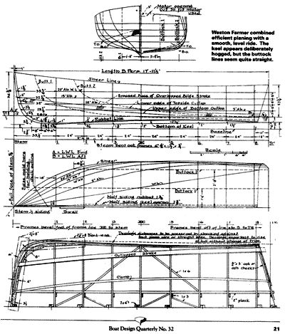 The construction sections reveal that the boat’s bottom, from the turn of the bilge to the keel, is outlapped (reverse lapstraked). Farmer saw this as a way of providing “peeler strips”—longitudinal steps or ventilators—for the out-flying water. Although not everyone would agree in detail, he considered their function identical to that of the strakes that Ray Hunt employed on his deep-V hulls at about the same time. Citing work done by George Crouch twenty years earlier, Farmer took no credit for the idea.