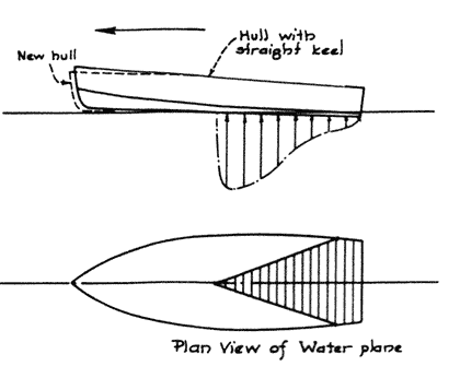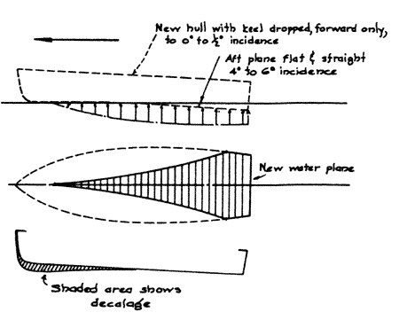 |  Trumpet's desiger compared a normal planing hull (above) to a "decalage" hull (below): "Because of its deepened forefoot, the latter gains lifting surface forward, softening the way for the planing surface aft."  |