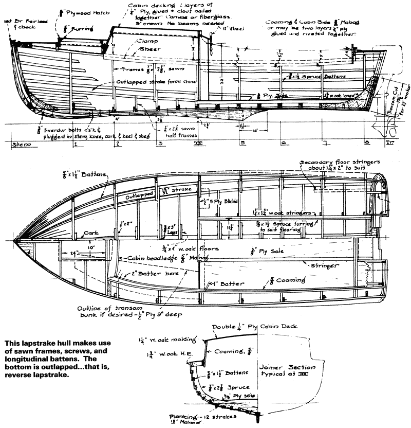 The construction sections reveal that the boat’s bottom, from the turn of the bilge to the keel, is outlapped (reverse lapstraked). Farmer saw this as a way of providing “peeler strips”—longitudinal steps or ventilators—for the out-flying water. Although not everyone would agree in detail, he considered their function identical to that of the strakes that Ray Hunt employed on his deep-V hulls at about the same time. Citing work done by George Crouch twenty years earlier, Farmer took no credit for the idea.