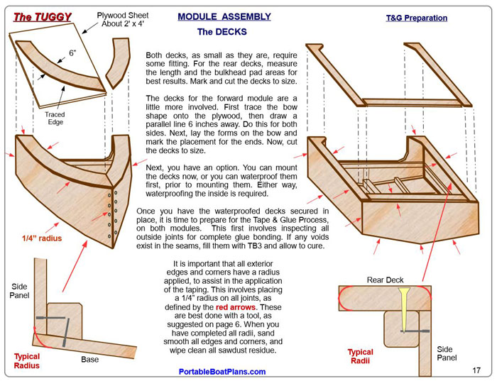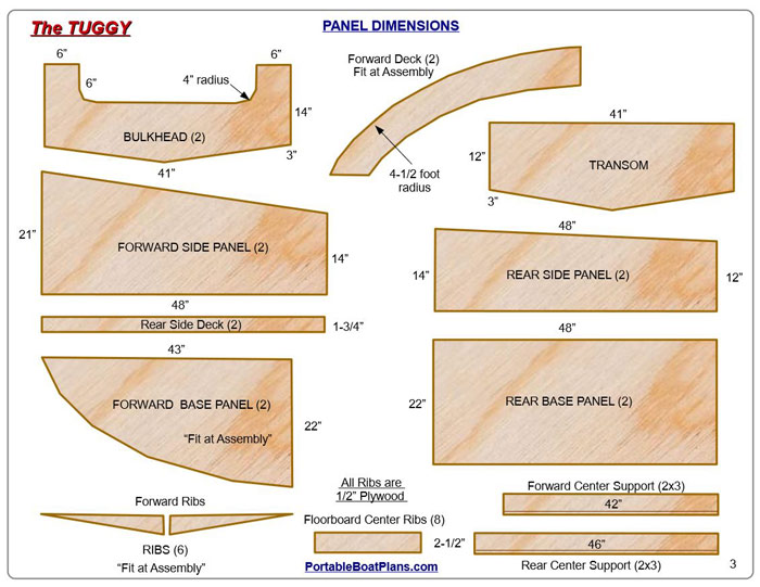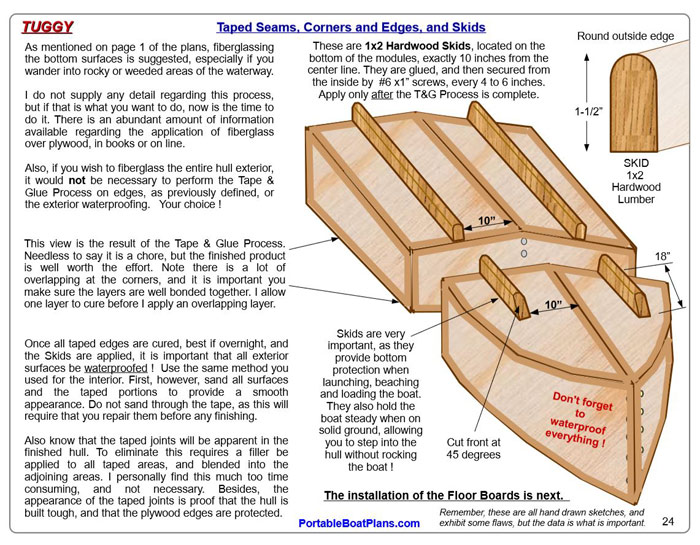To have strength and yet be lightweight, the plans use some non-traditional methods of assembly, specifically the “Tape & Glue 2” construction process developed and incorporated by the designer. This provides a durable, yet truly portable, finished boat, and the building process is easily mastered by the home handyman and amateur boat builder. As a result, only hand tools, a jig-saw, a power drill and a large carpenters square, scissors, and tape measure are all that will be required throughout the assembly process. Be selective in your choice of materials. Use plywood that is preferably exterior rated. Marine Plywood is very expensive, so the use of BCX Grade is recommended, but be choosy. It is important to note, the final choice of materials is the decision of the builder. We have made specific recommendations, but if the builder has previous experience with different methods and materials, that is their choice, and we respect that decision. Certainly, minor changes in design are encouraged, to provide a 'custom' boat to satisfy a builders specific needs. We do not make changes to the drawings. This would be up to the individual builder, and their responsibility. Also, it is very important that none of the basic design parameters be drastically modified, as this may adversely affect overall boat safety or performance.