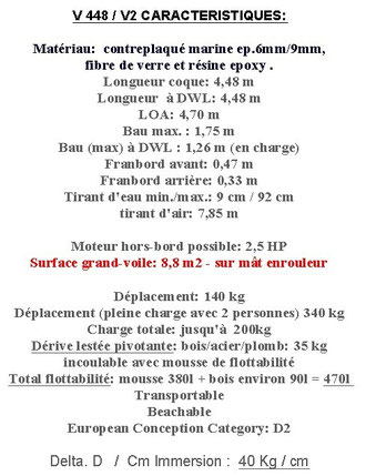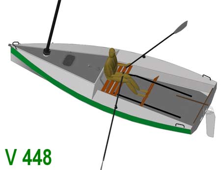 V448 is a rowing-sailing 4.50m modern design with room aboard, many sealed storage spaces for gear, an un-stayed, furling mast with one simple sail.