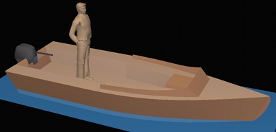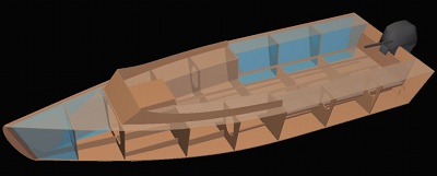 A classical motor launch based on a simple plywood epoxy semi-dory hull. Rear self-draining cockpit, a central siting place with protecting coamings, and a forward locker with a hatch.