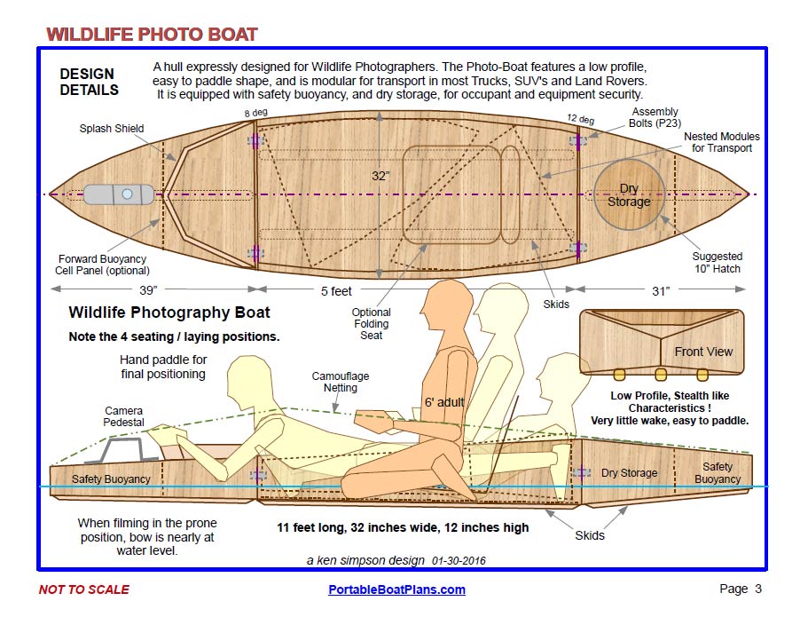 Although designed specifically for photographic purposes, the boat can be re-configured as a hunting or fishing boat as well. By opening up the space behind the seating area, the day's catch can easily be stored, along with gear and equipment. The camouflage paint scheme is common to the needs of all of these uses, as are the hull's stealth characteristics! Finally, minor modification of the transom could also allow trolling motor power.