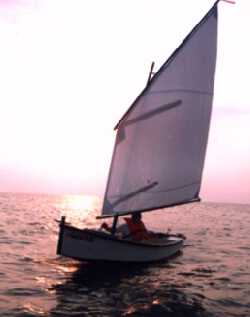 Here is another photo of Bill Moffitt's boat while sailing on the Gulf. Bill made his sail very recently using the patterns presented on this site a few issues back. He used a white polytarp kit from Polysails. I wanted to show this photo because the two large shaping darts are very clear in this backlit photo. This was Bill's first experience with sail making and both he and I would say it was quite a success. Looking at it there appears to be a bit of a wobble in the lower dart but the rest of the sail shapes perfectly to my eye. Also there is almost no twist to the sail overall, a great advantage in sailing to windward. I think proper placement ot the halyard on the yard is critical here and Bill has it right (I'd expect more twist in higher winds). This sail was taped together but Bill said the tapes were starting to lift in some places after a couple of weeks and he was going to sew it all up. Dave Grey who sells the Polysail kits points out that the adhesive tapes should be sewn on to be permanent, although the adhesive by itself will hold for a while. I think that is the future of polysails, myself - assembly with adhesive tapes which are then sewn down.