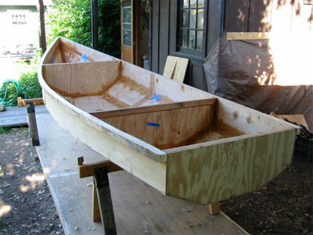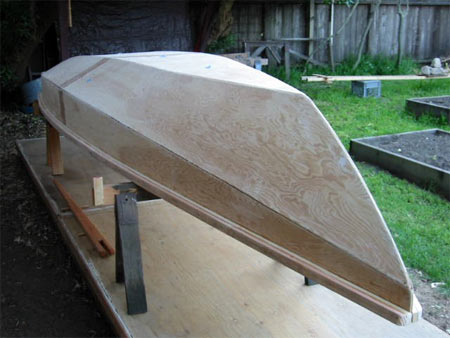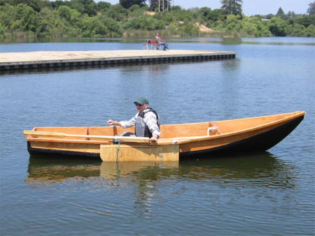 A quick clean job. By this time he had already made a polytarp sail from the Mayfly drawings shown in my book, a 75 sq ft job. But he launched it first as a rowing boat without its decks: