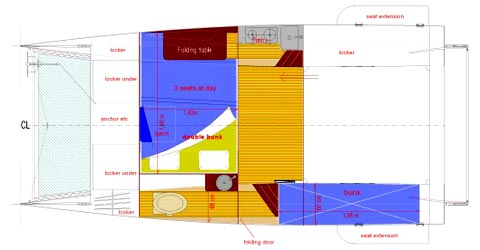 The most obvious differences are the Gunter rig, the trampoline at the front and the seat extensions which can be used as back rests too. A nice feature is the front seats.