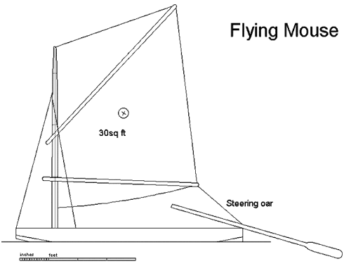 Flying Mouse is an exercise to develop just about the smallest, cheapest possible sailing boat I can conceive. As a result, it's not a boat to which you can safely trust your life in any sort of waves - as anyone who climbs into a Flying Mouse will quickly realise. Nevertheless, and I think it is capable of providing hours of summer fun in a strictly supervised environment, which isn't bad for a boat this cheap to build.